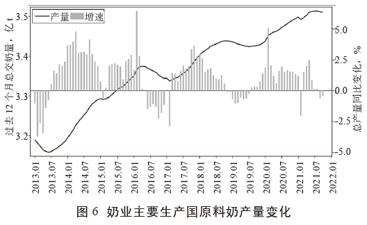 2 2021 年全球奶业经济形势 以美国、欧盟27 国(2020 年之前也统一按27 国口径统计)、新西兰、澳大利亚、阿根廷、俄罗斯、白俄罗斯、乌克兰、土耳其为代表(根据FAO 数据,2020 年这些国家奶类总产量占到全球奶类总产量的42.2%),2021 年下半年全球奶业主要生产国家的原料奶总产量结束自2019 年下半年开始的持续增长,连续下降(图6)。 这些生产国原料奶总产量的环比增速自2021 年6 月开始回落。截至2021 年8 月,主要生产国12 个月( 即2020 年9 月至2021 年8 月)累计总产量达到35 132 万t,同比增长了1.06%。2021 年8 月,主要生产国的总产量为2 946.4 万t,同比增长0.14%。自9 月开始, 主要生产国月总产量的同比与环比变化都转为下降。截至2021 年10 月,主要生产国当月总产量同比减少0.44%,12 个月累计总产量比8 月份下降0.09%。分区域来看,导致此轮全球产量下降的原因主要是西欧和大洋洲牛奶产量下降。澳大利亚自2021 年6 月以来月原料奶产量持续同比下降,2021 年10 月同比减少2.03%;新西兰产量自8 月份开始持续下降,10 月份产量同比减少3.30%。欧盟27 国原料奶总产量自2021 年9 月至10月连续下降,10 月产量同比减少0.43%。但是,俄罗斯原料奶产量在10 月份结束连续5 个月的同比负增长,当年实现同比0.59%的增长。 因为乳制品需求增长和主要生产国产量下降,全球乳制品价格趋于增长。2020 年5 月以来FAO 全球乳制品价格指数持续上升,但在2021 年5—8 月间出现连续下降,之后又快速回升,至2021 年12 月达到128.2,这也是近年的高点,与2020 年12 月相比上升了17.4%(图7)。 |