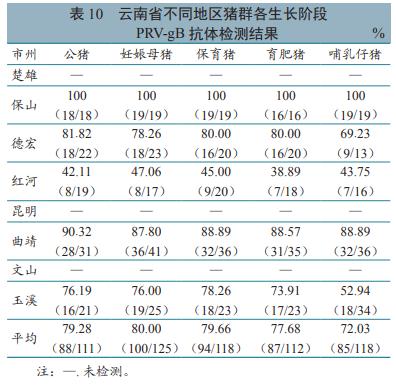 2.2.3 PRV-gB 不同州市统计结果(表 9)显示:保山市猪群 PRV-gB 抗体阳性率最高,为 100%,S/N 值为 0.14;其次是曲靖、德宏和玉溪,平均阳性率为 77.78%~87.71%;红河阳性率最低,平均阳性率为 43.33%。不同生长阶段猪群的统计结果(表10)显示:各阶段猪群的平均抗体阳性率变化不大,其中妊娠母猪最高(80.00%),哺乳仔猪阳性率最低(72.03%)。结果表明,云南省各市州猪场的 PR 免疫抗体水平总体不高,需要加强疫苗免疫,特别是哺乳仔猪。