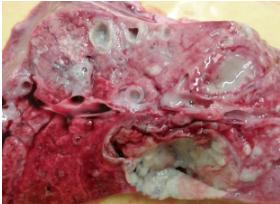 图6 卵巢囊肿 1.4 呼吸系统检查 猪只呼吸系统包括呼吸道和肺。临床上将鼻和鼻咽部称上呼吸道,喉、气管和肺称下呼吸道。由于巨大的呼吸道表面与大量的空气相互作用,猪只的呼吸系统每天都经历着巨大考验。通过检查鼻部的横切面,通常可以对萎缩性鼻炎进行屠宰检查。Gatlin等(1996年)开发出对萎缩性鼻炎损伤程度进行量化的形态测量技术,但对于现场而言,实用性较低。猪蓝耳病和PCV2等病毒性疾病感染往往导致间质性肺炎。传染性胸膜肺炎急性感染往往导致膈叶出血坏死,慢性感染会导致纤维素渗出性黏连(图7)。链球菌、巴氏杆菌感染会导致肺脓肿(图8)。肺炎支原体的感染往往发生在尖叶、心叶和膈叶的局部组织,以早期感染的紫红色肉样变到后期的灰白色病变为主,病变部位和健康部位之间的界限明显。肺部检查在屠宰场检查中应用最为广泛。 除此之外,屠宰场还可以根据需要对骨骼、心脏和淋巴系统等进行检查,监测上市猪群的健康状况。 图7 肺脏感染传染性胸膜肺炎 图8 肺脏脓肿 |