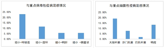 2.与重点疫病混感情况 水禽细小除引起雏禽发病造成较高伤亡外,还可引起感染群体免疫抑制,临床常与其他混感,其中与MDRV混感比例最高。(图6) 图6 细小与重点疫病混感情况 本病一旦发病,往往造成不可逆的影响;临床防控需加强生物安全,切断传播途径的同时,需做好“种商一体化”预防。 (二)水禽呼肠孤病毒(MDRV) 2023年上半年检测MDRV阳性样本相较于2022年同期,MDRV检出率显著提高。(图7) 图7 MDRV阳性病例疫病检出情况 1.阳性病例群间、空间及日龄分布 MDRV各品种各品种均易感,其中番/半番、肉鸭最易感;山东、江西、江苏等水禽主产区MDRV病毒感染风险较高;0-6周龄雏禽感染风险最高,往往伴随高死淘率,耐过禽易形成“僵鸭”,生长受阻。 图8 MDRV病毒流行特点 |