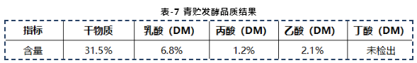原料品质 牧场新旧青贮过渡期间,青贮窖顶部、中部和底部的窖面温度分别为37.8℃、13.2℃、26.5℃,不同位点温度变化较大,存在二次发酵问题,感官鉴定青贮颜色黄绿色,酸香味较淡,发酵指标检测如下表: