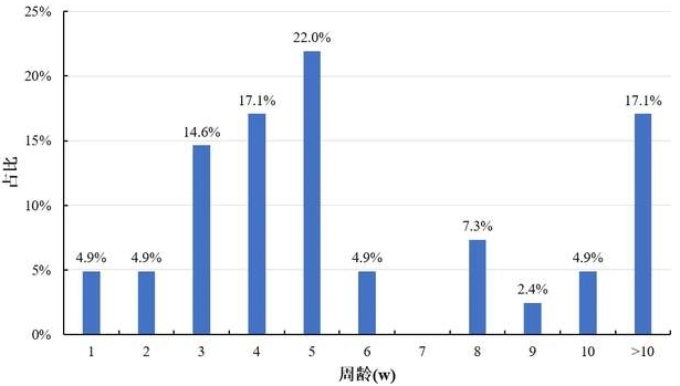 图44. FAdV感染鸡的周龄分布(肉鸡)