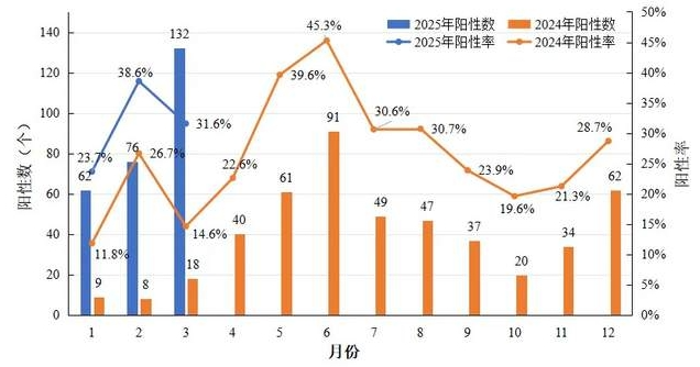 9. 水禽呼肠孤病毒(Waterfowl reovirus,WRV) 25年1季度共送检1220个场,检出291个WRV阳性场(鸭272例,鹅19例),阳性率23.9%,比去年同期增加了15.6%。 共检出270个NDRV阳性场(鸭267例,鹅3例),鸭为主要感染宿主,检出占比98.9%,其中肉鸭占比96.0%,种鸭和蛋鸭也有零星检出。值得注意的是,在广东、广西和福建鹅中各检出1例NDRV。江西肉鸭场中检出2例NDRV,并混感MDRV。 共检出16个GRV阳性场,阳性数为去年同期的2倍,阳性率同比增加3.0%。广东8例、山东4例、安徽和江西各2例。 共检出7个MDRV阳性场,均检出于肉鸭,阳性率为0.8%。广东4例、江西2例,山东1例,去年同期仅在广东鹅场检出1例。 表1. 水禽呼肠孤病毒阳性场群数及阳性率 NDRV检出量呈现上升趋势,较去年同期大幅增加,3月份出现新的高峰。 图60. NDRV时间分布 山东为NDRV的重点检出地区,检出数占总阳性数的74.1%(200/270),多个地级市均有分布,以聊城和临沂居多,潍坊和德州也有较多检出。 图61. NDRV宿主——地区分布 |
