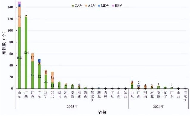 ARV、IBDV、CAV和ALV等免疫抑制病原检出数量增幅明显。CAV共检出389个阳性场,是去年同期的17.7倍,阳性率30.2%,同比增加19.9%。其中三黄鸡检出最多,共计191个,占比49.1%。 CAV分布于广西(124例)、山东(106例)、江苏(47例)和广东(42例)等17个地区。MDV检出13例,阳性率21%,主要分布于广东和山东,广西、福建和湖北也有零星检出。 REV去年同期无检出,今年新增5个阳性场,位于山东烟台(4例)和潍坊(1例)。阳性率较低,仅3.1% ,主要感染蛋鸡,肉鸡占比22.7%。 图12. 肉鸡免疫抑制病原地区分布 ALV检出87个,阳性率20.5%。肉鸡主要流行ALV-J亚型,分布于山东(24例)、江苏(13例)、河北(7例)和辽宁(5例)。各种免疫抑制病原之间相互混感严重。CAV除了与IBDV和ARV混感外,与IBV、MS、MG和H9等混感也较为常见;ALV主要与IBV、IBDV、CAV和ARV等混感;MDV和REV主要与CAV发生混感。 图13. 肉鸡 ALV地区——基因型分布 |