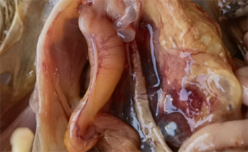 在育成期,甚至前几周,不管是肉鸡还是蛋鸡,只要是雌性,都可能发生该问题。 (1~2周龄)感染传染性支气管炎病毒 这种早期的输卵管炎,可能跟输卵管临近的气囊发生大肠杆菌感染有关。 由大肠杆菌引起的幼鸡的输卵管炎。这种病变不常发生,但常常与涉及左腹气囊的气囊炎有关。 而产蛋期的输卵管感染多是从肛门逆向感染到输卵管。 大肠杆菌感染引起的输卵管炎也可以在育成期的鸡中发生。输卵管扩张,管壁变薄,充满了干酪样渗出物。 凡是能导致呼吸道和气囊感染的(大肠杆菌、MG和IBV等)的问题,即使是在育成期,都可能影响到输卵管(母鸡)。 黄羽肉鸡,伴随有气囊炎;解剖仅发现1例; 根据禽病学,该问题是大肠杆菌败血症后遗症的其中一种;新生雏鸡在孵化后的前48小时内非常容易受大肠杆菌感染。死亡率也很高。结局通常是死亡,但是一些病鸡康复后会有一些后遗症,在一些部位可能仍有局部的感染存在,比如说大脑、眼睛、滑膜组织等(输卵管)。 早期输卵管的IBV(传支)感染可能是一个重要的诱因(野毒或者一些疫苗毒)。 |