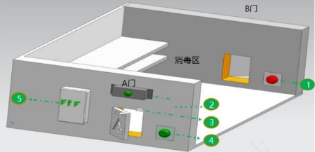 图1 三段式智能洗消示意图 1)智能电箱;2)智能洗澡控制盒;3)智能沐浴盒;4)智能识别盒;5)智能分线盒;6)声光显示盒 图2 物资智能消毒示意图 1)应急开关;2)智能物资控制盒;3)电子门锁;4)启动开关;5)智能物资电箱 2.4.3 实行严格的区域洗消程序 楼房猪场应确定不同级别的生物安全区域,通常划分为红区、橙区、黄区、蓝区及绿区五级生物安全区域,红区(未知危险区):外部一切不可控社会区域;橙区:猪场外部可控区域,包括猪场(二级)洗消烘中心、待售中转区、办公区、隔离区、后勤人员生活区、餐厅、粪污与死猪处理区等;黄区(场内生活区):猪场内部,主要指场内生产人员宿舍、餐厅、娱乐活动室等;蓝区(安全区):生活区至猪舍之间外部区域,包括道路、料塔、相关车辆等辅助设施;绿区(生产区):猪舍及连接内部区域。进出不同级别的生物安全区域有不同的洗消程序,应严格按照程度执行。 2.5 加强猪场软件管理,构建猪场生物安全防控长效机制 2.5.1 提高员工生物安全意识 再好的猪场设计、先进的设施设备,最终需要依靠人来实现其功能,生物安全也不例外,因此,提高全体员工尤其是一线员工的生物安全意识,对猪场生物安全防控起关键作用,猪场需定期对他们进行生物安全培训和演练。 2.5.2 执行生物安全标准化操作 楼房养猪生物安全防控涉及到养猪生产的方方面面,须建立明确的操作规范,这也是现代猪场标准化生产的要求之一。因此,制定并严格执行生物安全标准化操作程序(SOP),确保各项生物安全措施能够得到有效落实。 |