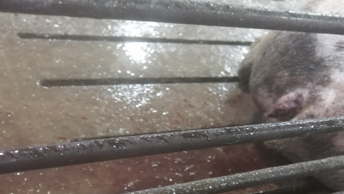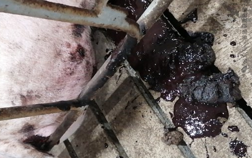 临床出现血便。如粪便区别于正常的灰、绿松软粪便而呈暗红色、酱油色、黑色或者带血,后备猪肛门周围有黑色、酱油色的粪污附着。