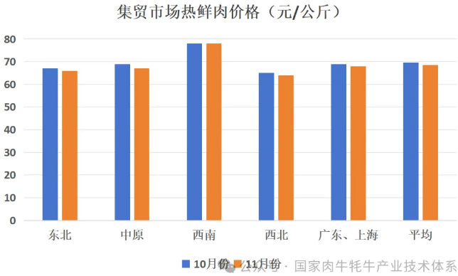 图1.集贸市场热鲜牛肉价格变化(以上图表数据来源:体系监测整理) (2)超市鲜牛肉销售量和价格均略有下降:11月份24个超市的牛肉销售量为82595公斤,环比下降6%。腿肉是11月份超市销量较大的热鲜牛肉品类,销量占整个热鲜牛肉销量的50%以上,但与上个月腿肉消费量相比有所减少。鲜牛肉价格平均为75.18元/公斤,与上个月相比略有下降。横向对比来看,11月份超市鲜牛肉价格比集贸市场牛肉价格高10.3%。 2. 餐饮渠道 (1)火锅渠道牛肉消费量和价格同步增长:火锅是牛肉户外消费的重要模式,11月份体系监测的火锅店消费牛肉总计约为139805公斤,环比增长31%。火锅店消费牛肉均价为161.46元/公斤,较上月(151.78元/公斤)上涨7%。 (2)品类分化显著:“上脑、眼肉”等兼具风味与性价比的品类成为餐饮渠道消费主力。餐饮渠道11月份最大的牛肉消费品推荐中, “上脑”和“眼肉”等肉品被推荐的比例达到20%,但该比例较上月下降了19%。肥牛产品占肉类消费品的比重比较稳定,占比约为7%。 (三)行业发展信心评估 1. 养殖主体:整体养殖信心持续提振,略有增长。约64%的养殖户和企业认为当前活牛价格处于“正常”水平,比上月增加5个百分点。但认为当前活牛价格处于“较差”水平的比例由上月的27%下降到23%。这说明养殖信心较之前有所增长。 2. 屠宰主体:产业信心有所增长,局部下降。约有58%的屠宰主体认为屠宰产业发展处于“正常”水平,比上个月增长了3个百分点,但认为屠宰产业处于“差”水平的比例由上月的0增长到18%。 3. 餐饮主体:盈利预期下降。约有60%的餐饮主体认为获利处于“正常”的水平,比上月下降11个百分点。而认为“差”或“较差”的比例由上月的16%增长至20%。 四、结论与建议 (一)主要结论 1.养殖环节分化明显:母牛存栏持续下降,犊牛价格环比回落,反映上游扩产意愿仍偏谨慎;架子牛存栏增长、交易年轻化,显示育肥环节对后市预期转好。 |