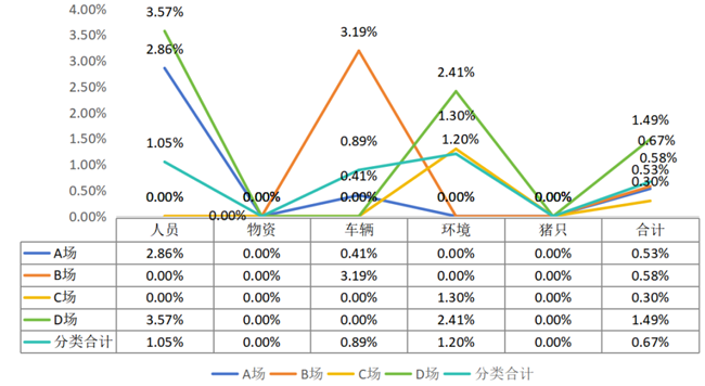 7、场D本月检出4份阳性,检出位点为外围办公人员和外围辅助生产人员,办公区域和外围附属设施。该场面临的疫情压力较大。该场办公区域为猪场生产区外,办公人员每上下班,有带毒传播风险;外围辅助生产人员同外界接触较多,存在加大风险。外围和辅助生产人员对场区生物安全有较大威胁。仔细梳理外围风险,并采样相应措施,降低外侧人员、物资和车辆的传播病原风险,将风险阻挡在生产区、场区之外。
