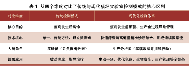 过去的几年内,猪场实验室大多被视为猪发病后的“诊断工具”。当前,实验室的角色已经发生了根本性的转变,成为猪场健康管理的“预警雷达”与“决策中枢”。通过实验室常态化的病原体与抗体监测,实验室工作人员能够描绘出猪群的“健康地图”,在猪只疫情暴发前识别风险,在猪只免疫后评估免疫效果,从而实现了从“被动治疗”到“主动防控”的战略转变(表1)。然而,与这一理想定位形成鲜明对比的是,许多猪场实验室的实际运行效能远未达标,其核心价值未能充分释放与体现。本论文的核心任务在于,穿透表面现象,解析制约规模化猪场实验室检测体系效能的关键瓶颈。 1 当前规模化养猪场实验室检测存在的突出问题 1.1 检测意识与需求的结构性失衡:从“不想检”到“过度检”的转变 养殖端对实验室检测的认知普遍存在一定的误区,呈现两极分化分布。部分猪场仍持“重治疗、轻预防”的传统疾病防控观念,认为生产稳定时检测是非常“浪费”的事情。而另一些猪场则在经历大的疫情后,盲目进入“过度诊断”的生产误区,表现为“强制捡,到处检”——将同一样本送至多家机构比对,或追求检测项目的数量而非质量,却对检测结果缺乏深入分析和后续行动。这种失衡反映了养殖户对检测的目的性认知模糊,对检查机构的不信任:检测究竟是为了寻求养殖者的“心理安慰”,还是真正为了指导生产上的“科学决策”? 而更深层的问题在于,养殖者对猪只的主动监测比例严重不足。一项对市级兽医实验室的调研显示,其接收的样本中,被动性的疫病诊断送检占主导地位,而由养殖场主动发起、用于评估群体健康状况或免疫效果的监测样本比例严重偏低。这导致实验室的预警功能被大大的弱化,常常在疫情发生后才能真正的介入。 1.2 检测技术与临床需求呈现“两张皮”现象 当前猪群疫病流行态势极为复杂,混合感染、继发感染成为猪病发展的常态。例如,一项2024—2025年的监测数据显示,副猪嗜血杆菌和猪回肠炎在猪场的阳性率分别高达78%和66%,猪蓝耳病病毒(PRRSV)与猪圆环病毒2型(PCV2)的阳性率也达到37%。面对这种复杂疾病防控局面,许多猪场的实验室仍依赖传统的单一病原检测方法(如常规PCR或ELISA),犹如“盲人摸象”,难以全面揭示病原谱全貌,容易漏检新发病原或变异毒株。 同时,检测结果严重脱离生产一线。许多实验室仅对送检样本负责,出具一份充满数据和“+/-”符号的报告,却没有结合该猪场近期的生产数据(如流产率、死淘率)、免疫程序、饲养管理等关键背景信息进行综合分析解读。报告给出的建议也是千篇一律,缺乏针对性和可操作性,导致养殖场拿到报告后“感到困惑”,不知如何将数据转化为具体的防控措施。 |