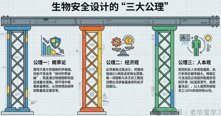最近又进了猪场,将猪场生物安全流程又走了几遍。总的感受,是生物安全流程越来越优化了,但,还是不完美。之所以这样,是因为制定生物安全流程的人对生物安全的基本原则理解不到位。 猪场生物安全设计原则(部分)这个链接是我写于2019年的生物安全手册的一部分内容,有兴趣可以回顾一下。内容很多,但是最重要的,应该是几个基本原则: 一,生物安全“三大公理” 我相信经过几年的防非实践,大家对概率论都已经有了认识,近几年“做减法”也正是为了降低防非成本,然而,我认为“人本观”还做得不够好。 强调一下:规则的“反人性化”程度越高,执行失败的概率越高,应当以人道原则换取员工100%的规则依从性。 二,生物安全三轮驱动 |