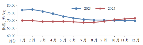 摘要:2025 年我国羊肉价格呈先降后升的趋势,肉羊存栏量、出栏量与羊肉产量均下降,贸易逆差持续收窄。肉羊产业科技水平稳步提升,在育种技术、营养饲料、疫病防控、屠宰与羊肉加工及环境控制等领域取得阶段性突破,为产业转型升级注入了创新动能。当前我国肉羊产业仍面临韧性不足、成果转化率不高、绿色转型等核心问题,养殖户经营效益提升仍面临挑战。未来应进一步推动肉羊生产节本增效,增强应对市场、自然及疫病等多重风险的能力,以科技赋能与机制创新双轮驱动,助推肉羊产业实现高质量发展。 2026 年中央一号文件将“提升农业综合生产能力与质量效益”列为首要任务,并对“菜篮子”工程提质增效作出系统性专项部署,为肉羊产业转型升级明确了战略方向,即在消费需求演变与资源环境约束的双重背景下,须依托科技赋能、成本优化、产业链整合及绿色转型等路径,主动培育竞争新优势。《中国农业展望报告(2025-2034)》中指出,受养殖效益波动影响,2025 年我国羊肉生产已进入“优化调整期”,叠加农产品消费健康化、多元化趋势加速演进,羊肉消费需求增长动能有所减弱。当前我国羊肉传统消费市场已划分完毕,亟需开拓新的市场,肉羊产业发展面临从“增量扩张”到“质量优化”的关键转变。本文在分析 2025 年肉羊产业发展概况和技术研发进展的基础上,剖析当前产业发展存在的问题,预测 2026 年我国肉羊产业发展趋势,并提出进一步促进肉羊产业高质量发展的政策建议。 1 2025 年我国肉羊产业发展概况 2025 年中央农村工作会议对多元化食物供给体系建设作出分层部署:夯实供给体系基础,推动畜牧业提质增效与稳定发展,健全重要农产品市场调控机制,促进农牧民持续增收。对于处于结构调整深化期、亟须增强产业韧性及提升发展质效的肉羊产业而言,上述部署构成了明确且及时的政策指引。总体看,本年度我国肉羊产业发展情况整体呈现如下特征: 1.1 羊肉价格呈先抑后扬态势,全年小幅上涨 2025 年全国羊肉集贸市场年度平均价格(以下简称羊肉价格)从 1 月份的 70.1 元 /kg 升至 12 月的 71.6 元 /kg,总体上涨了 2.1%。但羊肉价格季节性波动特征依然显著,整体走势呈现“ 先抑后扬” 态 势。 其 中,1—7 月 羊肉价格下降程度较大,由 70.1 元 /kg 快速降低至 68.9元 /kg,下降了 1.7%;8—12 月羊肉价格呈现稳步回升态势,由 68.9 元 /kg 升至 71.6 元 /kg(图 1)。与 2024年同期相比,2025 年前 3 季度羊肉价格总体低于上年水平;上半年,6 月平均价格较 1 月下降了 1.3%,其中 2 月同比下降了 9.4%,下降幅度最大;进入下半年后,尤其是自 9 月起,羊肉市场批发价格企稳回升,同比价格增长率自 9 月由负转正,并持续扩大至 12 月的约2.4%,反映出市场供需关系的逐步改善。在春节羊肉消费旺季拉动下,2026 年开年价格有望延续上涨趋势。 2025 年羊肉市场价格出现阶段性回落,主要是受供给端扩容与需求端增速放缓的双重影响:一方面,国内肉羊产能持续释放,羊肉进口量保持增长,市场供给总量充足;另一方面,居民消费需求增长相对滞后,阶段性供需失衡导致价格下行。与此同时,牛肉、猪肉等其他主要畜产品价格走势对羊肉价格形成了明显的交叉抑制效应:作为羊肉核心替代品的牛肉价格由 65.7 元 /kg增加至 71.3 元 /kg,上涨了 8.5%,但整体仍处于近 5年来的相对低位区间,未能对羊肉价格形成显著的拉动效应;猪肉价格较 2024 年由涨转跌,全年集贸市场均价同比下降 18.9%,从年初的 27.9 元 /kg 回落至年末的22.6 元 /kg,低价猪肉进一步分流了羊肉消费需求;鸡肉价格全年同比下跌 5.8%,进一步强化了畜禽产品整体价格的下行压力。 |