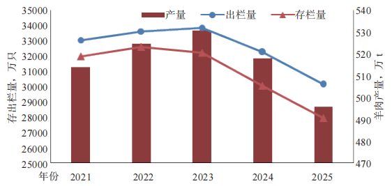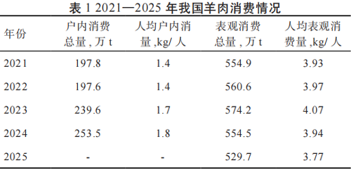 1.2 肉羊产能延续调整,养殖效益持续承压 2025 年,我国肉羊产能延续小幅收缩态势,羊出栏量、存栏量及羊肉产量均呈现下降趋势。具体来看,全国羊出栏30 143 万只,较上年减少 2 216 万只,下降 6.8%;年底羊存栏 27 962 万只,同比减少 2 087 万只,下降 6.9%。从出栏率(本年度出栏率 = 本年度出栏量 / 上一年年末存栏量 ×100%)看,近 5 年羊只出栏率均保持在 100%以上,2025 年达到 100.3%,较上年有所回升,侧面反映了当前肉羊市场供应能力较强。羊肉产量方面,2025 年全国产量为 496 万 t,较上年减少 22 万 t,同比下降4.2%。整体而言,我国羊存栏量已连续 3 年下降,当前存栏量处于近年低位;羊出栏量亦延续下降趋势,达到了近 5 年羊出栏量的最低值,反映了产能持续收紧(图 2)。 在成本收益方面,2023—2024 年我国肉羊生产成本虽有所下降,但在羊肉市场价格整体低迷的背景下,养殖效益进一步下滑。散养肉羊每只物质与服务费用①为 841.3 元,人工成本为 553.3 元。其中,物质与服务费用以仔畜费(占比 57.1%)和精饲料费(占比27.0%)为主;人工成本中家庭用工折价占 98.5%。尽管每只散养肉羊平均主产品产量提升至 53.2 kg,但由于价格走低,产值降至 1 391.7 元 / 只,同比下降 3.1%。2024 年每只散养肉羊平均净利润降至 -3.1 元,较上年下降 105.4%,为近 5 年最低水平,较 2020 年净利润高点(205.8 元)下降 208.9 元,养殖经营压力显著。 1.3 羊肉进出口逆差收窄 2024—2025 年,中国羊肉进口量下降,出口量有所增长,贸易逆差呈现缩小态势。进口方面,2025 年羊肉累计进口 33.9 万 t,同比减少7.5%;进口金额 91.8 亿元,同比增长 11.2%;从进口品类来看,冻带骨绵羊肉是中国第一大羊肉进口品类,2025 年进口量为 31.2 万 t,同比增长 5.1%。从主要进口国来看,中国羊肉进口主要来源于新西兰和澳大利亚,从两国进口的数量占中国羊肉进口总量的 98.9%。出口方面,2025 年中国羊肉出口总量达到 0.22 万 t,同比增长 22.2%;羊肉出口总额达到 1.5 亿元。主要出口品类为冻带骨绵羊肉,占羊肉出口总量的 66.5%。主要出口国(区域)包括德国、日本、韩国等,其出口量占比分别为 26.2%、17.4% 和 7.3%。 1.4 羊肉消费规模逐步放缓 国内羊肉消费正呈现结构性变化:羊肉表观消费总量较上年呈现下降趋势,然而人均户内羊肉消费保持稳定的上升态势。2025 年我国羊肉表观消费量(表观消费量 = 国内产量 + 进口量− 出口量)达到 529.7 万 t,比上年减少 4.5%;人均表观消费量也从 2024 年的 3.94 kg/ 人降低到 2025 年的3.77 kg/ 人(表 1)。 |