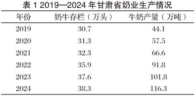 甘肃省地处黄土高原与内蒙古高原过渡带,位于国际公认的“黄金奶源带”,气候干燥、光照充足,昼夜温差大,为奶牛养殖提供优越自然条件[2]。全省草地面积达2.41亿亩,人工种草留床面积约1601万亩,年产优质牧草和秸秆饲料95万吨,秸秆饲料化利用率达78%,为奶产业发展奠定了坚实基础[3]。2024年,甘肃省明确提出建设“甘肃乳都”和百亿级河西走廊黄金奶源基地的战略目标,将奶产业列为现代农业“首位产业”,并通过《现代丝路寒旱农业优势特色产业三年倍增行动计划》等一系列政策,累计投入超5.5亿元财政资金,全力推动产业链整合升级,产业规模与质量实现持续提升。