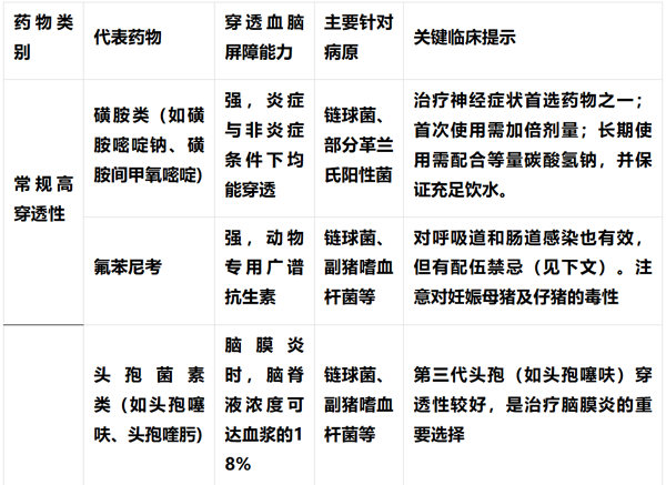 针对猪场出现的神经症状,合理选择能透过血脑屏障的抗生素是关键。这通常意味着猪可能患有细菌性脑膜炎,最常见的病原是猪链球菌,其能破坏血脑屏障。以下是常用药物、治疗方案及配伍的详细指南。 一、核心治疗药物选择 治疗细菌性脑膜炎,需选用能有效透过血脑屏障的药物。根据穿透能力和抗菌谱,可分为以下两类: 二、针对神经症状的治疗方案与配伍 出现神经症状时,治疗需 “抗菌”与“对症”相结合,并注意药物间的协同与禁忌。 1. 核心抗菌治疗方案 确诊或高度怀疑为细菌性脑膜炎(如猪链球菌脑膜炎型)时,可参考以下方案: 重症脑膜炎首选组合:头孢噻呋(5mg/kg,每日1次) + 磺胺嘧啶钠(首次剂量加倍,20mg/kg)。此方案利用了头孢噻呋的强效杀菌和磺胺的高屏障穿透力,是有效的紧急处置方案。 经典替代方案:复方磺胺嘧啶钠注射液(含甲氧苄啶)单独肌肉注射,首次加倍。或使用阿莫西林/克拉维酸(20mg/kg,每日2次)联合恩诺沙星(5mg/kg)。 针对混合感染:若伴有严重呼吸道症状,疑为副猪嗜血杆菌等混合感染,可考虑氟苯尼考+替米考星的“呼吸道”组合,但此方案主要用于呼吸道,治疗脑膜炎时需评估磺胺或头孢的联合使用。 2. 辅助对症治疗药物 控制症状、降低颅内压和神经保护同等重要: 降低颅内压:使用甘露醇(1g/kg)静脉注射,可快速缓解脑水肿。 抗炎与抗休克:短期使用地塞米松(0.2mg/kg),有助于抑制炎症、稳定血脑屏障。 |