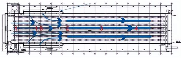 二、鸡舍环境控制和管理 (一)环境控制设备 立体养殖采用的环境控制设备大体上与平养模式类似,都包括风机、湿帘、加温系统(风暖或水暖)、通风小窗、导流板和环控仪等。但层叠式笼养时养殖密度大幅提高,配制设备的复杂度大幅提高。需要根据具体饲养量及鸡群体重,按照环境参数细致计算各种设备需要的数量以及安装位置。需要对饲养鸡群所需要的最大最小通风量、风速、通风阻力等进行仔细计算,还需要兼顾考虑进风位置、新进空气温度、通风死角、温差大的问题。配置的环控仪最好是具备智能调控功能的程控仪。 鸡舍多施行负压通风,每幢鸡舍后部需配备多组高效风机,推荐使用拢风筒风机,提高通风效率(图4)。两侧墙体安装通风小窗,规格约为30cm×60cm,在提高通风量的同时保证舍内气流稳定。根据不同日龄的通风需要,通过控制小窗角度调整侧面进风量。夏季采用湿帘进风降温时,建议采用湿帘分级控制,防止湿帘开启后湿帘端温度下降过快。应根据鸡舍笼具高度、顶棚高度等调整湿帘和侧墙小窗进风口导流板开启角度,保证入舍新风进入鸡舍顶部空间形成射流,使舍内外空气达到较好的混合效果,避免入舍新风直接吹向笼具,造成鸡群冷热应激。纵向通风控制方案见图5。 图4 拢风筒风机 育雏供暖可使用地暖或者暖风机均匀供热方式,应用多排联控保温门,降低能耗提高保温性能。冬季较为寒冷的地区,建议在鸡舍加装墙体阳光棚和热回收装置,可以大幅度降低供暖能耗。 图5 通风控制方案 |