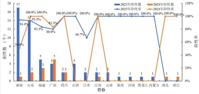3. PoRV 送检的64个场群中有56个检出PoRV,阳性率为87.5%。湖南检出17个阳性场,阳性率为94.4%,显著高于去年同期。山东检出14个,阳性率为93.3%,其余省份阳性场数均在5个或以下。当前PoRV的流行情况较为严峻,该病毒与其他病毒混合感染会增加猪场养殖成本,造成较高的经济损失。 图17. PoRV阳性率——地区分布(场群) 图18. PoRV阳性率——时间分布(场群) PoRV与PEDV的混合感染在临床中最为常见,43个PoRV阳性场群中,28个存在PEDV混感,混感率为65.1%,两者混感会加剧腹泻症状。PoRV与细菌的混感情况也较为严重,其中,与产气荚膜梭菌混感率达到85.7%(12/14),与E.coli的混感率为68.0%(17/25)。猪场在防控PoRV的同时,应加强PEDV和细菌的防控,避免混感加重病情,造成更大的损失 图19. PoRV混感率(场群) |