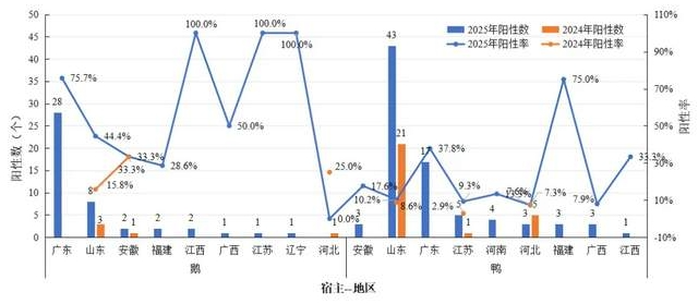 11. 水禽细小病毒(Waterfowl parvovirus,WPV) 共检出127个WPV阳性场,阳性率17.2%,阳性数同比增加103例,阳性率同比增加12.1%;3月份阳性数达到63例。WPV主要检出于肉鸭(59.1%),肉鹅感染的场群阳性率为29.1%,种鹅、种鸭和蛋鸭也有不同程度的检出。各日龄均能感染,8w内检出较多,占比85.0%,尤以4~5w感染较为严重(54/127)。 图68. WPV时间分布 WPV主要检出于山东(51例)和广东(45例)。 图69. WPV宿主——地区分布 WPV混感较为复杂,常与GoAstV-II、SE和RA等多个病原发生混感;与GoAstV-II混感率最高,为76.7%;混感数量最多的为DuCV,混感率也达到43.3%,二者混感后可增加红皮毛刺鸭的出现率,严重影响经济效益。 图70. WPV混感情况 |