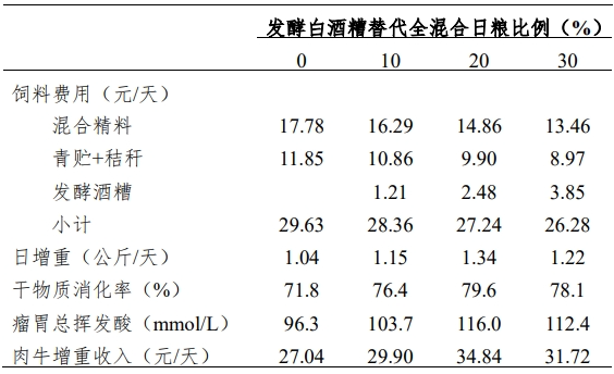 使用发酵酒糟替代育肥牛全混合日粮的比例建议为 20%—30%,替代基础母牛全混合日粮的比例建议为 10%—20%。 发酵酒糟可与全株玉米青贮、玉米、豆粕、菜籽粕、棉籽饼等饲料原料配合使用,推荐配方如下: 表 2 使用发酵酒糟的全混合日粮配方 发酵酒糟替代比例不宜超过全混合日粮的 30%,过多使用影响消化率和日增重效果。使用过程中应定期检测发酵酒糟的营养成分和卫生指标,如发现霉变等变质现象应及时停用。初次饲喂时应设置 7—10 天过渡期,过渡期内逐渐增加发酵酒糟添加量,直至适当比例。 三、实践效果 该技术已在山西省交城县鑫源鑫牧场完成生产试验。结果显示,发酵酒糟替代 10%、20%和 30%的育肥牛全混合日粮后,肉牛日增重分别提高 10.6%、28.9%和 17.3%,干物质消化率分别提升 6.5%、10.8%和 8.8%,瘤胃总挥发酸浓度分别增加 7.7%、20.4%和 16.7%。 按肉牛精料补充料 3000 元/吨、全株玉米青贮 600 元/吨、玉米秸秆 600 元/吨、发酵酒糟 1000 元/吨和活牛 26 元/公斤的价格计算,结合试验结果,发酵酒糟替代全混合日粮比例为 20%时,肉牛养殖效益最佳。 表 3 使用不同比例发酵白酒糟替代全混合日粮应用效果 |