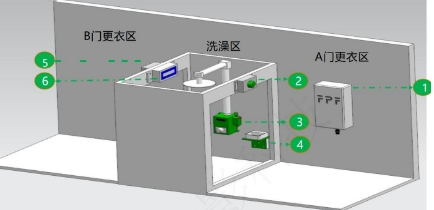 图1 三段式智能洗消示意图 1)智能电箱;2)智能洗澡控制盒;3)智能沐浴盒;4)智能识别盒;5)智能分线盒;6)声光显示盒 图2 物资智能消毒示意图 1)应急开关;2)智能物资控制盒;3)电子门锁;4)启动开关;5)智能物资电箱 2.4.3 实行严格的区域洗消程序 楼房猪场应确定不同级别的生物安全区域,通常划分为红区、橙区、黄区、蓝区及绿区五级生物安全区域,红区(未知危险区):外部一切不可控社会区域;橙区:猪场外部可控区域,包括猪场(二级)洗消烘中心、待售中转区、办公区、隔离区、后勤人员生活区、餐厅、粪污与死猪处理区等;黄区(场内生活区):猪场内部,主要指场内生产人员宿舍、餐厅、娱乐活动室等;蓝区(安全区):生活区至猪舍之间外部区域,包括道路、料塔、相关车辆等辅助设施;绿区(生产区):猪舍及连接内部区域。进出不同级别的生物安全区域有不同的洗消程序,应严格按照程度执行。 2.5 加强猪场软件管理,构建猪场生物安全防控长效机制 2.5.1 提高员工生物安全意识 再好的猪场设计、先进的设施设备,最终需要依靠人来实现其功能,生物安全也不例外,因此,提高全体员工尤其是一线员工的生物安全意识,对猪场生物安全防控起关键作用,猪场需定期对他们进行生物安全培训和演练。 2.5.2 执行生物安全标准化操作 楼房养猪生物安全防控涉及到养猪生产的方方面面,须建立明确的操作规范,这也是现代猪场标准化生产的要求之一。因此,制定并严格执行生物安全标准化操作程序(SOP),确保各项生物安全措施能够得到有效落实。 |