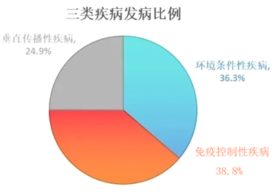 说明:本月三类疾病的发生比例无明显变化,其中免疫控制性疾病的发生比例由39.2%下降至38.8%,垂直传播性疾病的发生比例由23.9%上升至24.9%,环境条件性疾病的发生比例由36.9%下降至36.3%。逐步的进入环境稳定的阶段,疾病的发生数量趋于稳定。