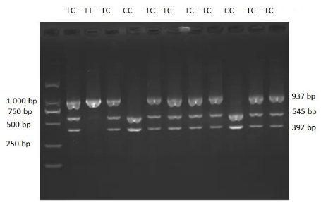 环指蛋白4(RNF4)是一种转录因子,在小鼠的睾丸中表达很高,可与雄激素受体互作。有研究者研究显示,RNF4蛋白作为一种转录协调子,在颗粒细胞、卵细胞及精细胞的发育过程中发挥着重要的调控作用。因此选择RNF4做为影响繁殖性状的候选基因。 1 材料与方法 1.1 材料 猪的耳组织统一放在-20℃保存备用。 1.2 方法 1.2.1 引物的设计与合成 根据RNF4 基因DNA序列设计引物,退火温度为59.1℃。 1.2.2 PCR扩增 PCR扩增后,可见937 bp的清晰目的条带。 1.2.3 限制性内切酶酶切(RFLP) PCR产物经内切酶酶切后,观察其分型结果。 2 结果与分析 2.1 猪RNF4基因的多态位点检测 当多态位点为TC基因型时,可见3个片段(937 bp+545 bp+392 bp);当多态位点为TT基因型时,可见一个片段(937 bp)(图1)。 猪RNF4基因SacII酶切分型结果 图1 猪RNF4基因SacII酶切分型结果 |