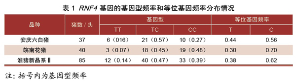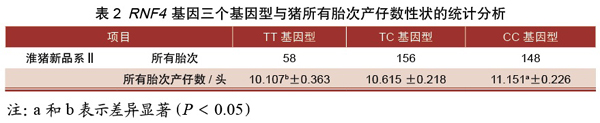 | 2.2 猪RNF4基因的基因型和等位基因的频率分布 发现RNF4基因经过SacII酶切后,在三个猪群中,C等位基因占优势(表1)。 2.3 猪RNF4基因三个基因型与猪所有胎次产仔数性状的关联分析 通过在淮猪新品系Ⅱ猪群体中分析发现,CC型个体的所有胎次产仔数显著高于TT型个体1.044头(P<0.05),C等位基因为优势等位基因。详见表2。 3 讨论 RNF4基因在颗粒细胞、卵细胞及精细胞的发育过程中发挥着重要的调控作用,并发现,RNF4基因的CC基因型在所检测的3个猪群中占优势,这与其他研究者的结果是一致的。所以,在今后的猪的选育初期,可以参考选择RNF4基因的CC型个体作为一个选留参数,以期提高猪的产仔数。 |