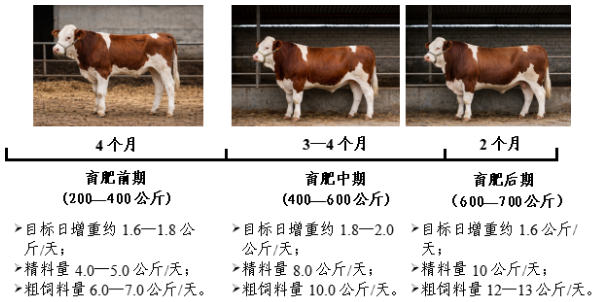 肉牛育肥生产一般是以10—12个月时间,将体重约200公斤的架子牛育肥至700公斤左右出栏。养殖场户为在生长速度、饲料成本与牛肉品质间取得平衡,通常采用分阶段饲养策略,将育肥周期划分为三个阶段。育肥前期(约5个月,体重200—400公斤),重点促进骨骼和内脏发育,目标日增重1.1—1.3公斤。此阶段精饲料用量通常控制在肉牛体重的1.0%—1.2%,日粮粗蛋白水平需达到14%—16%,综合净能水平5.6—6.0兆焦/公斤。育肥中期(约4—5个月,体重400—600公斤),重点支持肌肉发育和脂肪沉积,目标日增重提升至1.5公斤。精饲料用量逐步增加至体重的1.2%—1.4%,日粮粗蛋白水平可略降至13%—14%,而能量水平提高至6.2—6.6兆焦/公斤。育肥后期(约2—3个月,体重600—700公斤),为脂肪沉积期,目标日增重1.2—1.4公斤。此阶段精饲料投入最高,用量可达体重的1.4%—1.6%,日粮设计以高能量为核心,粗蛋白水平约为12%—13%,综合净能水平6.8—7.2兆焦/公斤。 在实际生产中,育肥周期受市场行情影响较大,中小规模场、散养户往往采取与集约化育肥场不同的育肥策略,根据自身经济条件、资源禀赋及市场环境作出灵活调整。我站在深入调研基础上,选择安徽牧丰农业科技有限公司、河北景鑫旭发农牧发展有限公司两个案例,分析解读其分别采用的“精饲高效肉牛育肥模式”和“粗饲均衡肉牛育肥模式”,希望能为广大肉牛养殖场户生产决策提供借鉴参考。 案例一:精饲高效肉牛育肥模式 一、生产模式概述 精饲高效肉牛育肥模式通过适当增加精饲料投入,提升牛只日增重,从而将育肥周期缩短至约9—10个月,实现从200公斤到700公斤体重的快速出栏。该模式不仅能降低维持性饲料在总成本中的比例,还可加快资金周转,尤其适用于集约化育肥场,形成“以精料换时间”的高效育肥路径。 二、具体案例介绍 1.育肥技术模式 安徽牧丰农业科技有限公司养殖有西门塔尔牛5000头,采用三阶段育肥方案,各阶段精饲料由玉米、豆粕、棉粕、DDGS等组成,粗饲料以全株玉米青贮、白酒糟、作物秸秆及果渣为主。育肥前期(200—400公斤)重点促进骨架生长和体躯扩张,目标日增重1.6—1.8公斤,时间约4个月,精料日喂量平均约4.0—5.0公斤,粗饲料饲喂量6.0—7.0公斤。育肥中期(400—600公斤),目标日增重维持在1.8—2.0公斤,时间约3—4个月,精料用量提高至平均约8.0公斤/天,粗饲料约10.0公斤/天。育肥后期(600—700公斤),目标日增重1.6公斤,时间约2个月,精料进一步提高至平均约10公斤,粗饲料约12—13公斤/天。 图1.1 精饲高效肉牛育肥模式 |