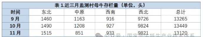 (1)繁殖母牛存栏变动呈现分化现象,产能去化问题可能得到一定程度的抑制:11月份监测村母牛存栏总量为13120头,与上月母牛存栏量相比有所减少,环比下降2.5%。东北产区和西南产区监测村母牛存栏量有增长趋势,但中原和西北监测村母牛存栏量则呈现下降趋势(见表1)。上述数据说明母牛持续下降趋势在部分地区有所好转,但仍有近一半的监测村母牛存栏量表现为下降特点。