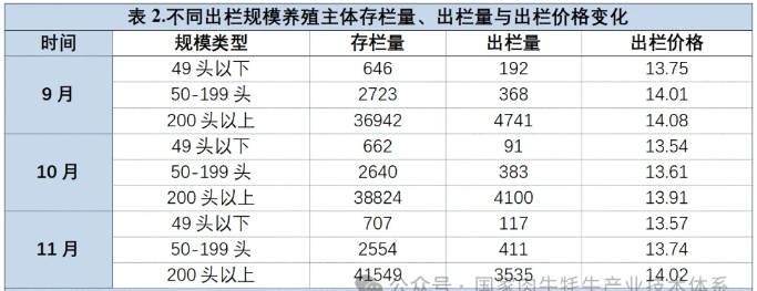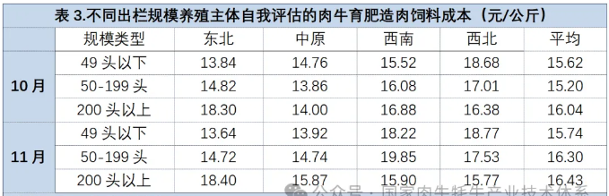 3. 育肥牛养殖 (1)49头以下养殖主体出栏肉牛数量和价格均增长:49头以下肉牛育肥监测户存栏约为707头,环比增长6.8%,出栏肉牛117头,环比增长28.6%。肉牛出栏价格约为13.57元/斤,环比增长0.2%。近三个月存栏量呈上升趋势,出栏量、出栏价格均呈先降后升趋势(见表2)。 (2)50至199头养殖主体出栏量和价格均增长:50-199头肉牛育肥监测户存栏量为2554头,环比下降3.3%;出栏量为411头,环比增长7%;肉牛出栏价格13.74元/斤,环比增长约1%。近三个月存栏量呈下降趋势,出栏量呈上升趋势,出栏价格总体趋势略有下降(见表2)。 (3)200头以上养殖主体出栏量和价格反向变动:200头以上肉牛育肥监测户存栏量为41549头,环比增长7%;出栏量为3535头,环比下降13.78%;肉牛出栏价格约为14.02元/斤,环比增长0.8%。近三个月存栏量呈上升趋势,出栏量呈下降趋势,出栏价格呈先降后升趋势(见表2)。 (4)造肉饲料成本呈现增长趋势:49头以下养殖主体当月日增重平均为1.12公斤,造肉饲料成本为15.74元/公斤,环比增长7.7%;50-199头养殖主体当月日增重平均为1.24公斤,造肉饲料成本16.30元/公斤,比上月增长7%;200头以上养殖主体当月日增重平均为1.22公斤,造肉饲料成本16.43元/公斤,比上月增长2.4%。四大产区之间存在明显差异(见表3),造肉饲料成本呈现上涨趋势。 4. 活牛交易情况 (1)市场活牛交易数量增加:11月份活牛监测市场上交易的活牛数量为372918头,环比增长4%。东北和西北两个产区活牛交易数量显著增长,中原和西南产区活牛交易量呈现小幅下降。(见表4)。 |
