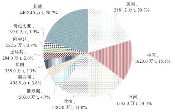 2025 年,全球经济延续中低速增长的新常态,新兴市场与发达经济体增速差距进一步收窄,但地缘政治冲突的余波、能源价格的阶段性波动仍在深刻影响全球产业链布局。各国货币政策仍呈现分化态势,部分经济体持续降息以刺激经济增长,少数国家仍维持紧缩政策,通货膨胀与汇率波动持续影响产业成本水平与利润空间。高致病性禽流感(HPAI)疫情的持续大规模暴发,以及贸易保护主义与区域贸易协定的双重作用,深刻重塑肉鸡产业贸易格局。同时,全球消费端对食品安全、健康营养的关注持续升温,推动肉鸡产业向高品质、标准化、可持续方向转型。本研究基于美国农业部(USDA) 发布的全球肉鸡生产与贸易数据,分析了 2025 年全球肉鸡产业运行总体状况、趋势特征及驱动因素,综述了产业技术与政策进展,并对产业未来发展进行展望。 1 全球肉鸡生产与贸易概况 1.1 全球肉鸡生产 全球肉鸡产量实现强劲增长。2025年,全球肉鸡产业积极应对 HPAI 疫情持续加剧所带来的巨大挑战,在较低的饲料成本以及积极的消费拉动等有利因素的支撑下,肉鸡产量实现较大幅度增长。根据 USDA 数据,2025 年全球肉鸡产量达到 10 755.4 万t,较 2024 年的 10 420.30 万t 增加 335.10 万t,增长 3.22%,增量和增幅均达近 5 年来最高水平(图 1)。 四大主产国(地区)肉鸡生产持续领跑,全球肉鸡生产格局头部高度集中特征显著。2025 年,四大主产国(地区)美国、中国、巴西和欧盟四大主产国(地区)肉鸡产量分别达 2 181.20万、1 620.00万、1 545.00万、1 182.00 万 t,较 2024 年实现了不同程度的增长,增幅分别为 2.20%、5.54%、3.00% 和 0.78%。四大主产国(地区)产量合计 6 528.20 万t,较 2024 年的 6 342.20 万t 增长186.00 万t,增幅2.93%。由于2025 年四大主产国(地区)合计产量增速低于全球整体水平,其产量份额较2024 年的60.86% 略有下降,为60.70%(图2)。四大主产国(地区)中,中国肉鸡产量增加数量和幅度均最大。 |