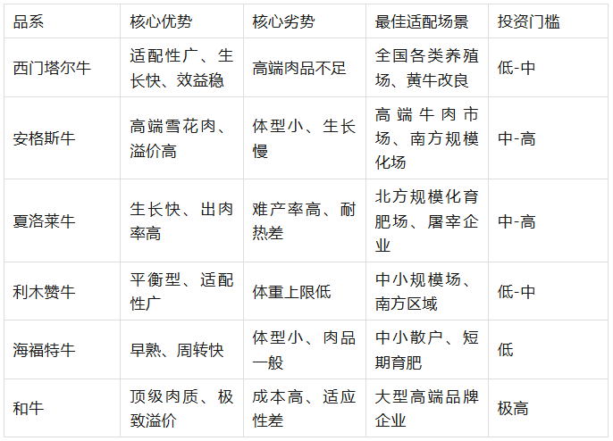 (五)综合经济效益优势: 1. 高端牛肉溢价能力极强,A5级牛肉单价是普通牛肉的5-10倍; 2. 品牌化价值极高,适合打造顶级牛肉品牌。 投资建议: 适合大型高端牛肉企业、品牌化牧场,需配套全产业链精细化管理、高端销售渠道,不适合中小散户、普通育肥场,投资门槛极高。 核心品系选型对比总表 选型核心建议: 1.中小散户/家庭农场:优先选择西门塔尔牛,适配性强、耐粗饲、效益稳,可兼顾自繁自养与育肥出栏,降低养殖风险。 2.南方规模化养殖场:优先选择安格斯牛、利木赞牛,耐湿热、肉质好,适配高端鲜销与中端牛排市场。 3.北方寒冷区域育肥场:优先选择西门塔尔牛、夏洛莱牛,耐寒、生长快、出肉率高,适配屠宰加工需求。 4.高端牛肉品牌企业:优先选择安格斯牛、和牛,打造高端雪花牛肉产品,提升品牌溢价。 5.黄牛改良基地:优先选择西门塔尔牛、夏洛莱牛作为父本,杂交改良本地黄牛,提升生长速度与出肉率。 肉牛养殖的核心不仅是品系选择,更依赖精细化饲养管理、营养调控、疫病防控与市场渠道。不同品系的优劣势是相对的,需结合养殖场的区域环境、规模、资金、技术、销售渠道综合选型,才能实现效益最大化。 |